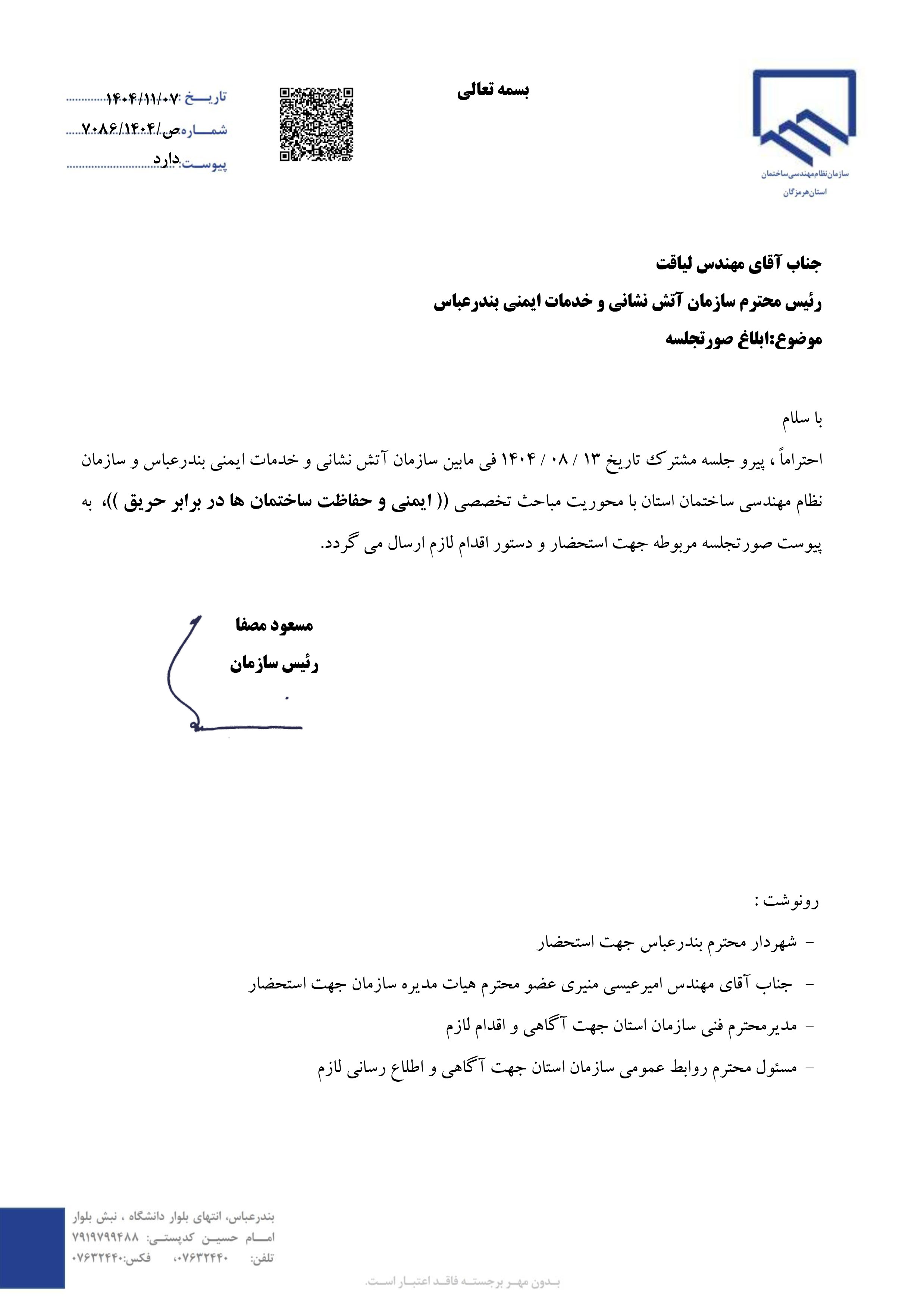 در پی برگزاری جلسه مشترک میان سازمان آتشنشانی و خدمات ایمنی بندرعباس و سازمان نظام مهندسی ساختمان استان، الزامات جدید ایمنی و حریق در فرآیند طراحی، نظارت و اجرای ساختمانها به مهندسین دارای پروانه اشتغال در رشتههای تأسیسات مکانیکی و برق ابلاغ شد.بر اساس این ابلاغیه، دریافت فرم تعهد جداگانه تأیید اجرای سیستم اطفاء حریق از ناظرین، با توجه به ارائه و تکمیل گزارشهای نظارتی، حذف شده است. همچنین تشخیص نیاز ساختمانهای مسکونی به اجرای کامل سیستم اسپرینکلر، در صورتی که ارتفاع ساختمان از ۲۳ متر تجاوز نکند، منوط به دستور سازمان آتشنشانی و درج در نقشههای معماری خواهد بود.در خصوص ساختمانهای مستقل با کاربری تجاری و اداری، تصمیمگیری برای اجرای کامل سیستم اسپرینکلر پس از بررسیهای لازم توسط سازمان آتشنشانی و با توجه به گروه ساختمانی، متراژ و مشخصات بنا انجام میشود.همچنین تأکید شده است در ساختمانهای پنجطبقه و کمتر، نصب جعبههای آتشنشانی در کلیه طبقات مطابق مبحث سوم مقررات ملی ساختمان و استاندارد NFPA 14 الزامی است. در ساختمانهایی که بیش از یک لابی دارند، طراحی و اجرای تکرارکننده سیستم اعلام حریق در لابی دوم نیز باید پیشبینی شود.بر اساس این مصوبه، انباریهای واقع بر بام ساختمانها که در گروه خطر معمولی یک قرار میگیرند، حتی در صورت عدم اجرای اسپرینکلر کامل در ساختمان، باید به سیستم اسپرینکلر مجهز شوند.این الزامات از این پس ملاک عمل مهندسین طراح، ناظر و مجری بوده و رعایت دقیق آنها در کلیه پروژههای ساختمانی الزامی استروابط عمومی سازمان نظام مهندسی ساختمان استان هرمزگان